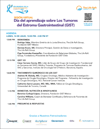 The Life Raft Group está comprometido con mejorar la supervivencia y calidad de vida de las personas que viven con Tumor del Estroma Gastrointestinal (GIST) y otras enfermedades raras, a través de la investigación impulsada por los pacientes, la educación, el empoderamiento y esfuerzos de defensa a nivel global. Nuestra visión es impulsar un futuro basado en datos, guiando nuestro camino hacia la cura de enfermedades raras.