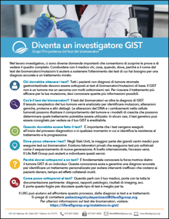 Abbiamo progettato questo spazio appositamente per te. Qui puoi trovare facilmente informazioni nella tua lingua. Avrai accesso a risorse educative, video, presentazioni, traduzioni di articoli interessanti e informazioni sulle attività svolte dalle organizzazioni di difesa dei pazienti GIST in tutto il mondo. Il nostro obiettivo è tenerti informato e aggiornato su ciò che sta accadendo in relazione a GIST, nella tua lingua. Naviga tra le lingue con i link a destra.